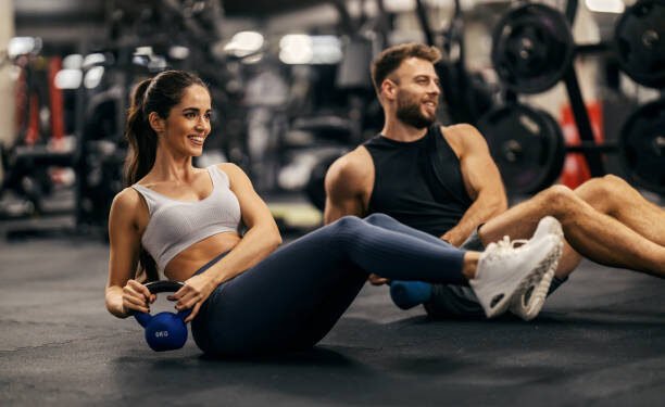 Fit sporty couple in shape is doing kettlebell twist in a gym together.